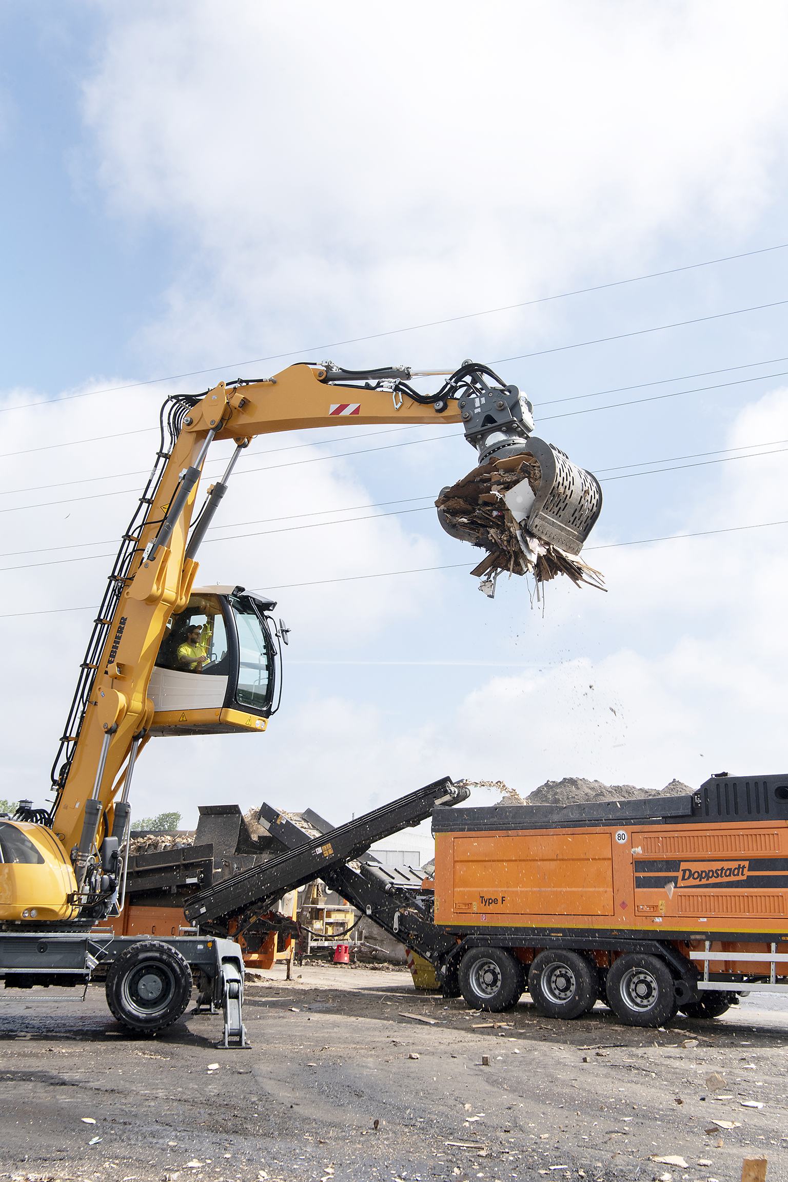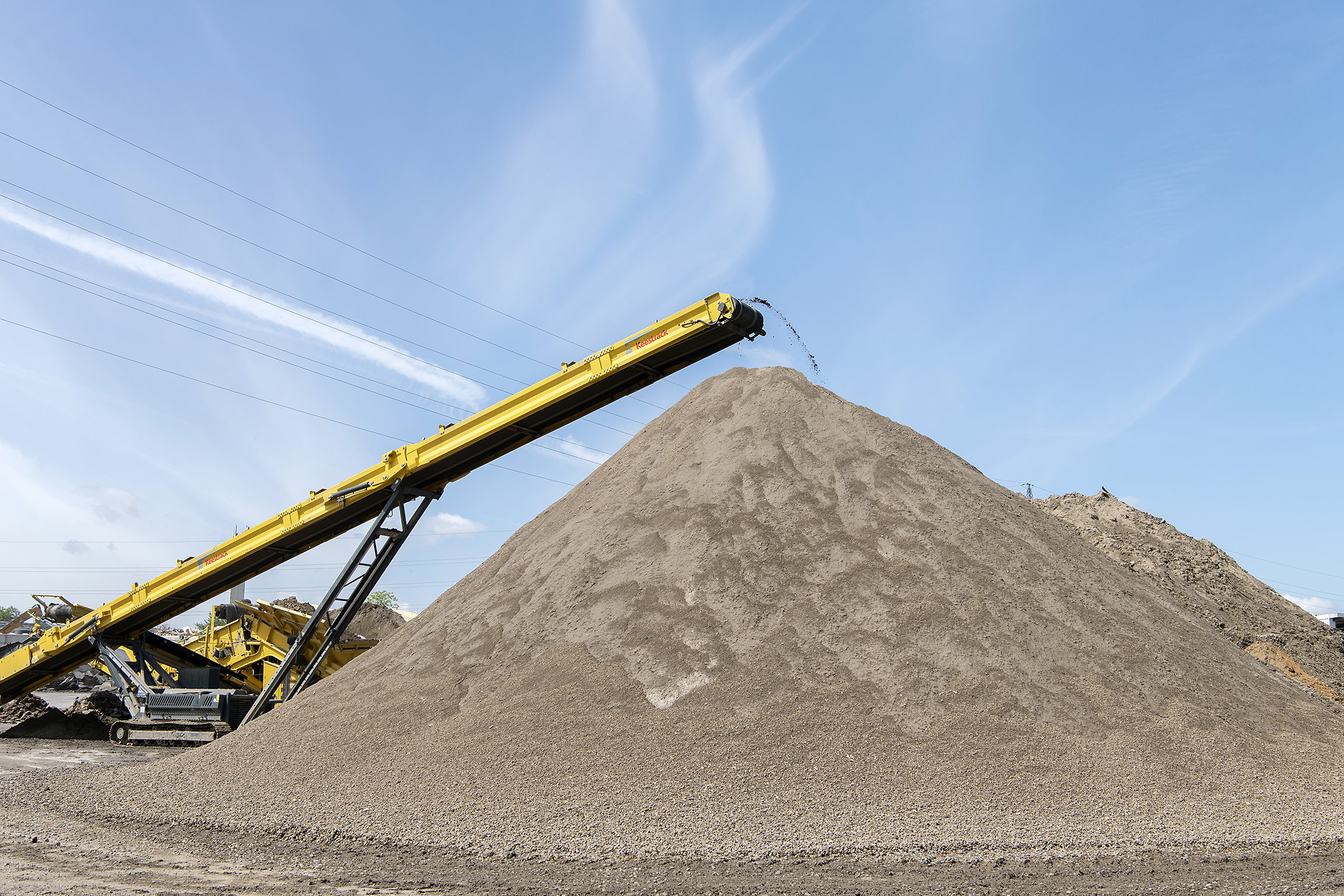 Mineralik mit Kantenlängen > 60 cm oder Beton mit sperrigen Armierungen werden vorab mit Meißel und Pulverisierer vorzerkleinert, um einen ungehinderten Anlagendurchlauf zu gewährleisten. Der eigentliche Aufbereitungsprozess beginnt mit der Baggerbeschickung eines vergleichmäßigten, mineralischen Abfalls in die Brecheranlage. Zur Erlangung der notwendigen Sieblinien erfolgt zunächst die Vorabsiebung feinkörniger Bestandteile und im Anschluss die Abscheidung unerwünschter Fremdstoffe wie Holz, Papier, Folie und Leichtbaustoffe per Windsichter. Der Stoffstrom ist nun optisch sauber und wird im Prallbrecher auf die in den einschlägigen Regelwerken zum Inverkehrbringen geforderte Beschaffenheit gebrochen und metallentfrachtet.